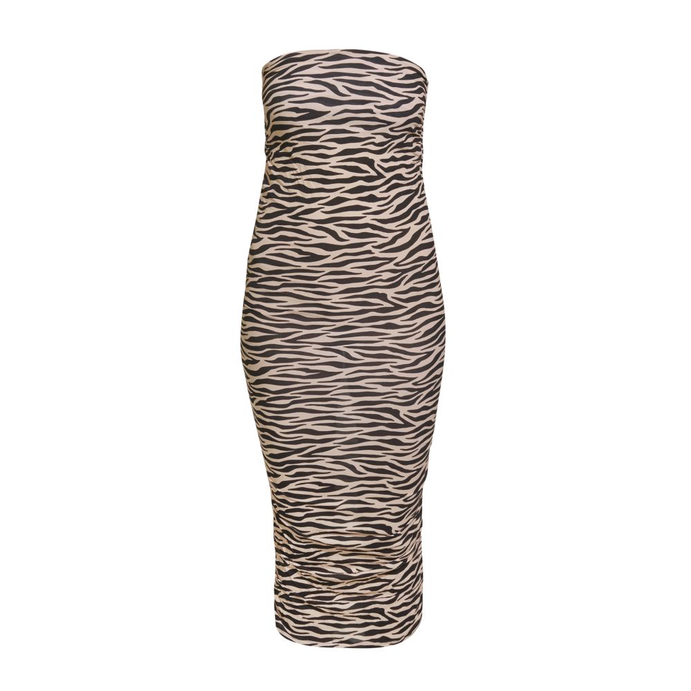 Multi-use accessory dress, made from animal print crepe. Unique size. Its gathered design and its versatility offer multiple functions to this accessory: long dress, short dress, skirt, top... We want each customer to find what they're looking for, whatever the circumstances Wild, animal print on a flesh-colored background for better realism and to contrast with the plain black fabric.