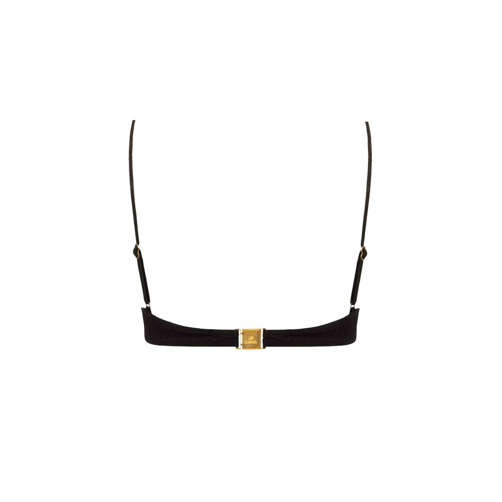 Textured knit bra with striped pattern on the front. Very slight sheen of the terra cotta stripe. Black back and straps. Adjustable straps. Foam basque and invisible inner structure on the front which provides good support despite the very thin straps. Terra cotta enameled golden buckle between the throat. Golden back hooking with logo.