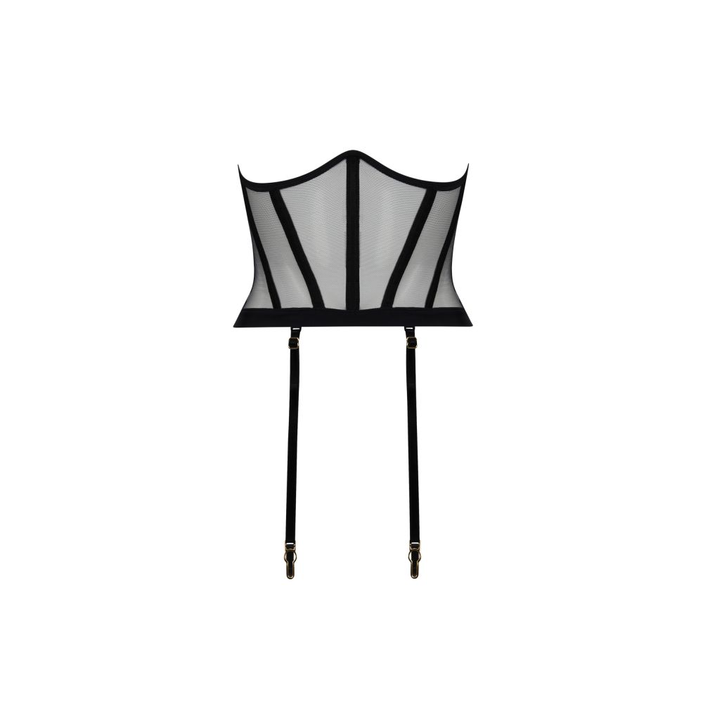 Curved waist in structured crystal tulle with whalebone cover, worn under the chest. The high shape hugs the underbust, and the waist is marked by a mesh band. The model has removable suspender clips with gold tips.