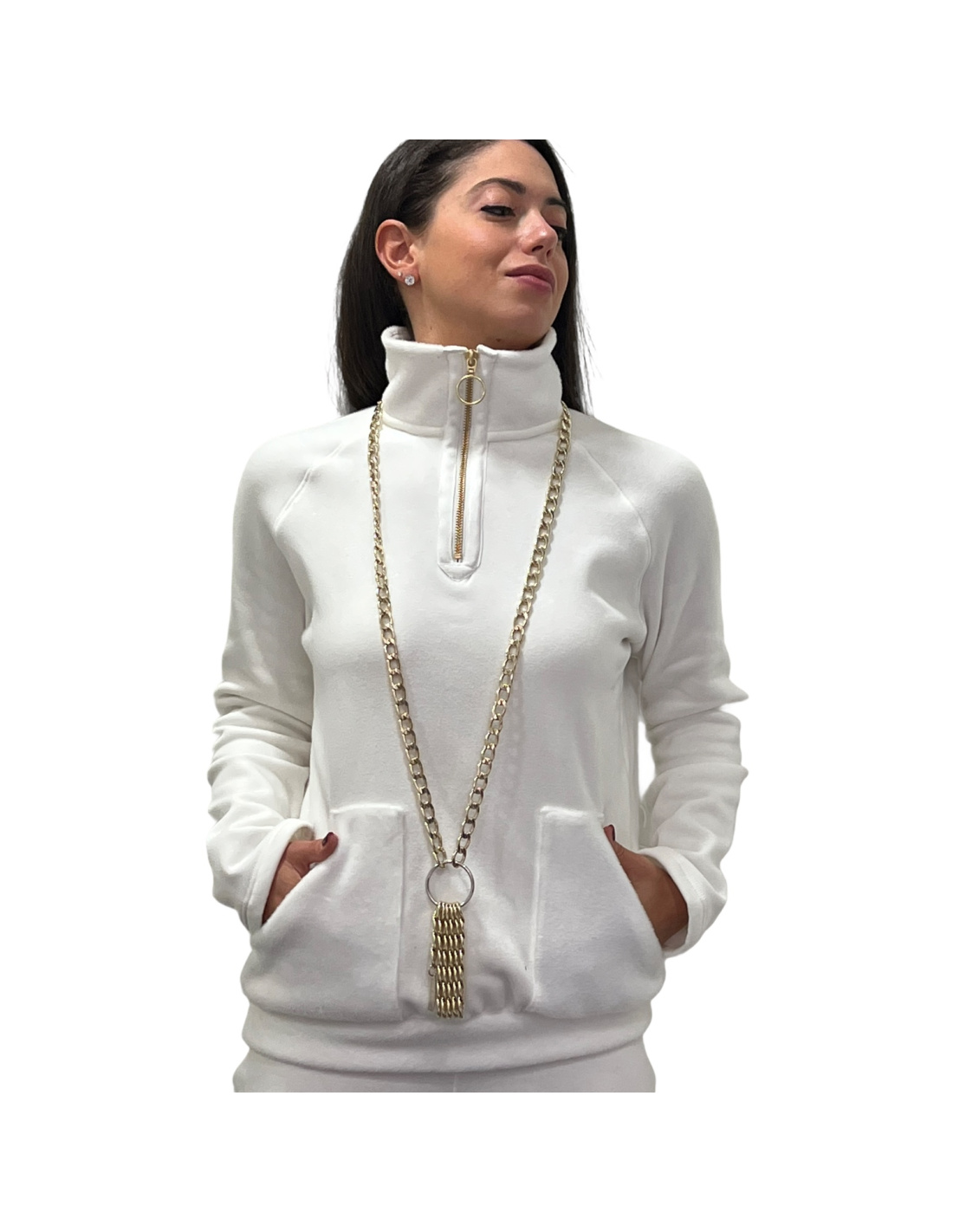 Monte Carlo fleece set made up of a zip-neck sweater and 2 front patch pockets, straight pants with front patch pockets, elasticated at the waist + drawstring, Monte Carlo series, Valery Prestige Homewear collection.