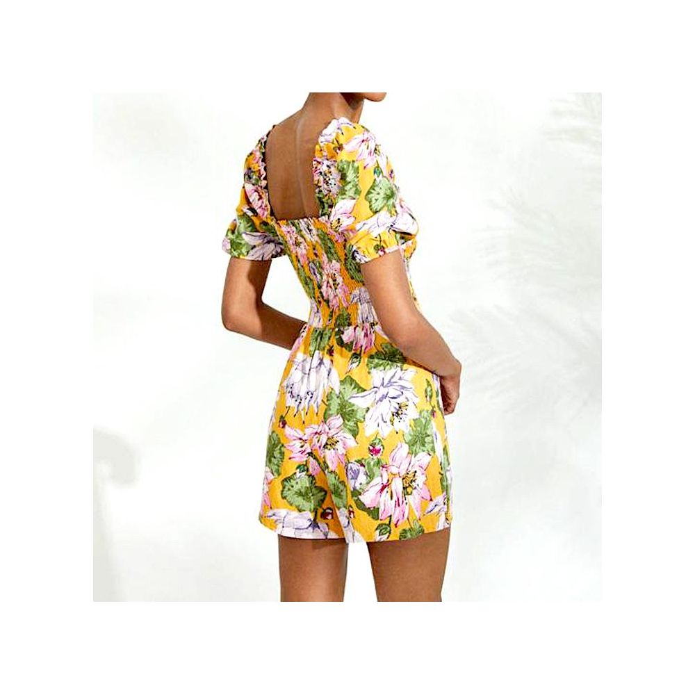 Florals in casual tones give color to this light and fluid playsuit ideal for summer days. Stretch seams that define the silhouette. Absolutely trendy puff sleeves.
