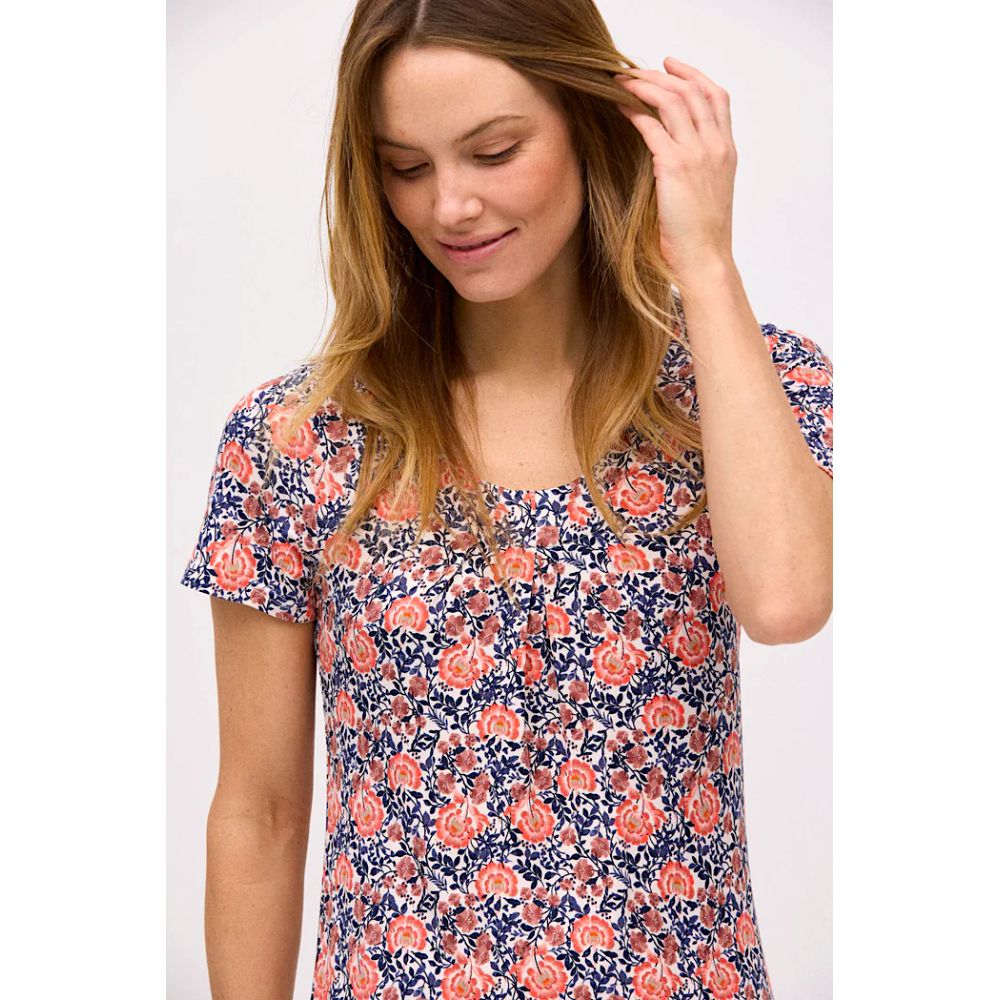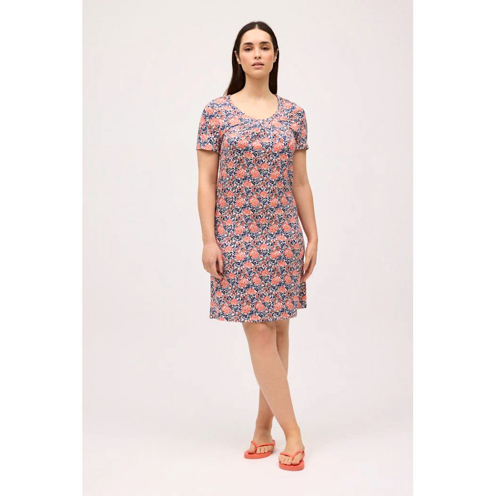 Short floral print dress. Round neck and short sleeves. Fresh, lightweight fabric. Pair it with a swimsuit or bikini from the collection to complete the look.