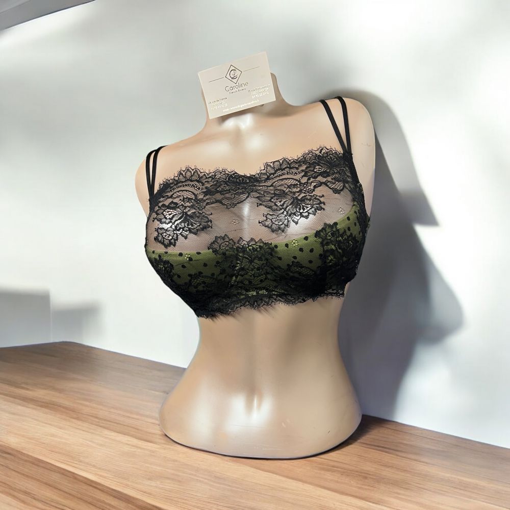 La collection Brigitte par AMBRA lingerie est un uni vert, recouvert de dentelle (Dentelle de Calais noire 100% Française)