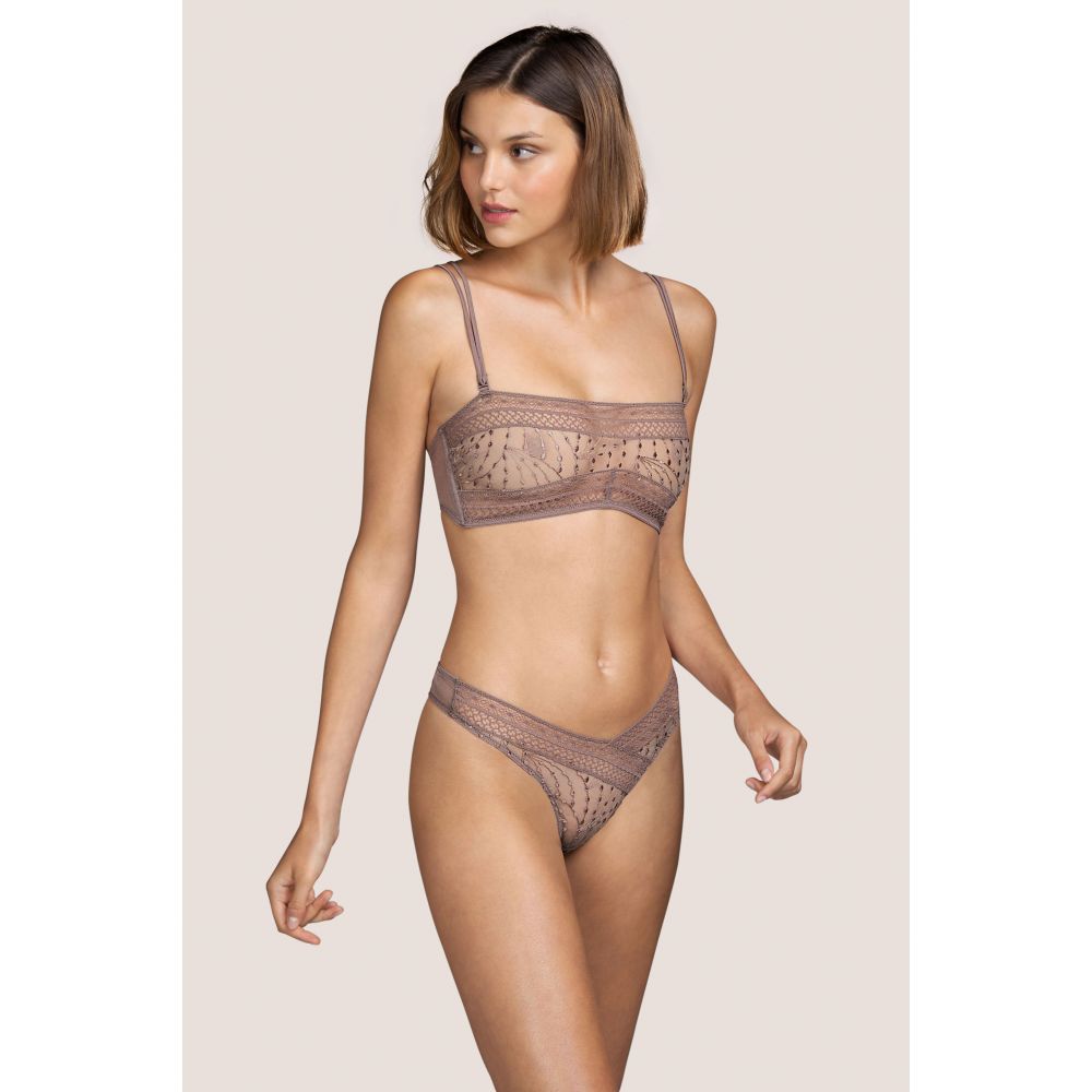 Tanga coupe haute ANDRES SARDA. Jeu graphique de dentelles croisées. Embelli d'un crystal Swarovski ton sur ton. Caribe Taupe, un ton caramel terrien.