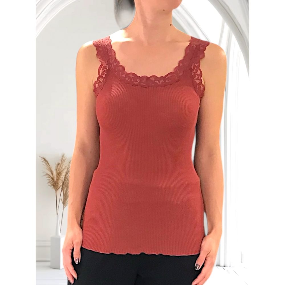 Débardeur femme CHIARA en laine mérinos et soie - A fines côtes et aux épaules en dentelle