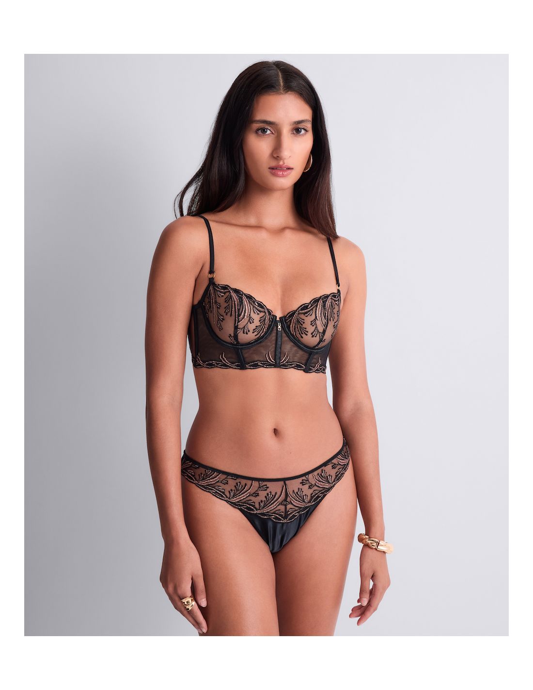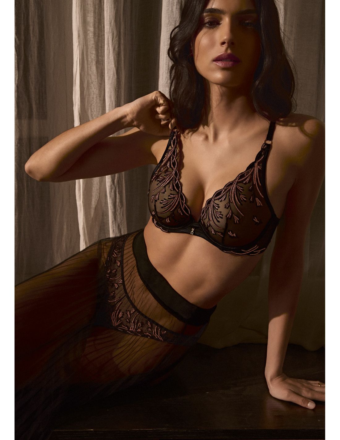 Sa broderie inspirée des arabesques végétales et son jeu subtil de transparence révèlent la sensualité avec finesse, tandis que des coupes raffinées offrent un équilibre parfait entre confort et sophistication.