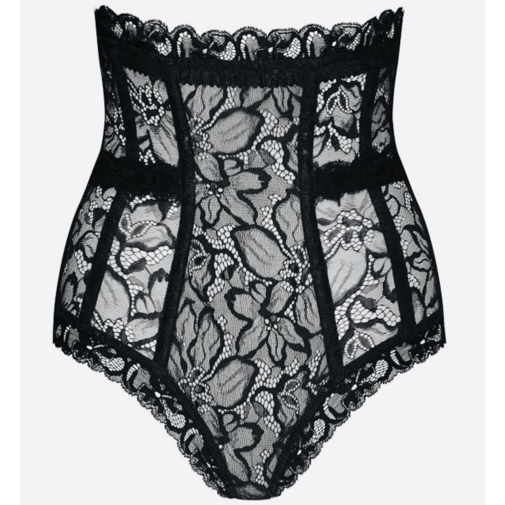 Culotte taille haute en dentelle noire transparente. Fermeture éclair devant, échancrure tanga au dos. structure des fines baleines souples visible en transparence.