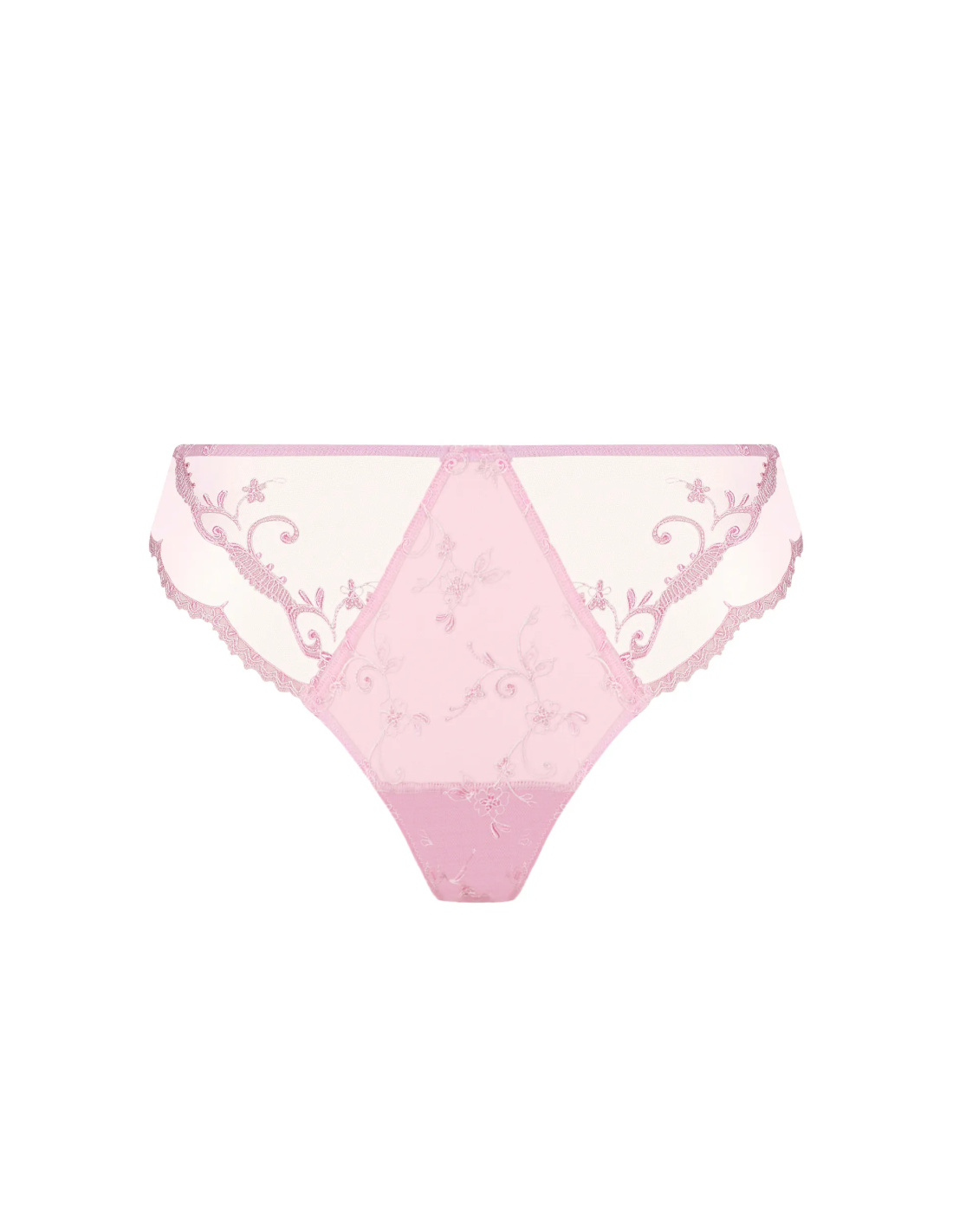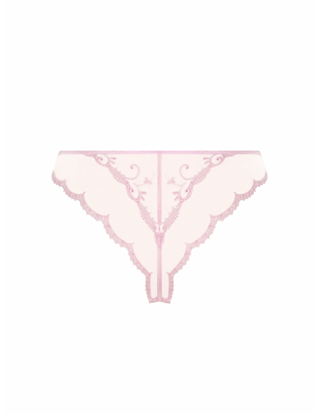 Tanga en broderie festonnée aux cuisses, agrémenté d'une découpe élancée en broderie multifil au côté devant et d'une laize brodée coordonnée au milieu devant. Le haut du dos est composé d'un triangle brodé festonné.
