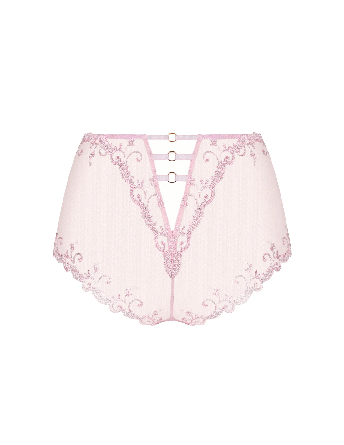 Slip sexy taille haute, plongeant dans le dos, composé d'un galon brodé au côté et d'une laize brodée coordonnée au milieu devant. Le dos est enrichi d'un empiècement brodé et d'un triangle en tulle invible surmonté de trois anneaux perlés dorés maintenus par des rubans satin élastique.