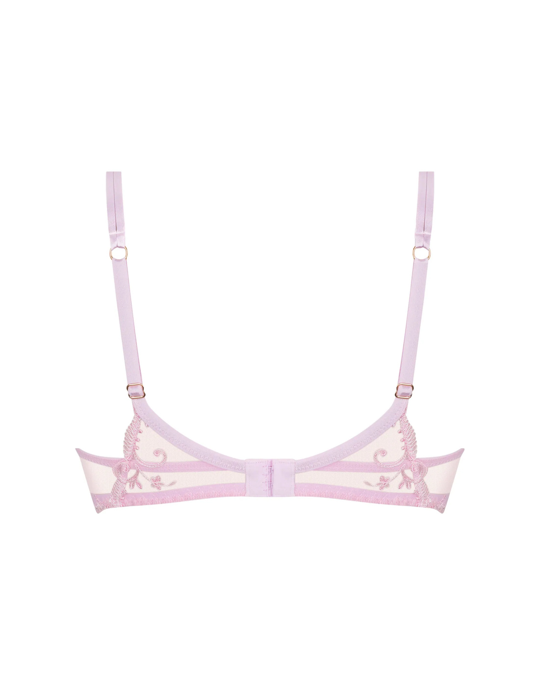 Bonnet en broderie multifils sur tulle invisible, festonné au décolleté. La basque, en bande brodée festonnée sur le devant est enrichie d'une découpe en galon brodé festonné au dos. Les bretelles, en deux parties, sont agrémentées d'un motif brodé floral au départ bretelle, puis d'un anneau perlé métallique. L'entre-gorge est sublimé par une perle nacrée. Collier amovible vendu séparément.