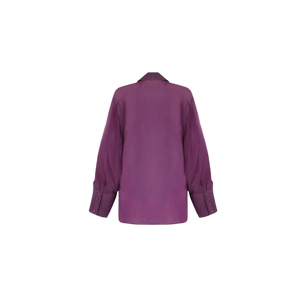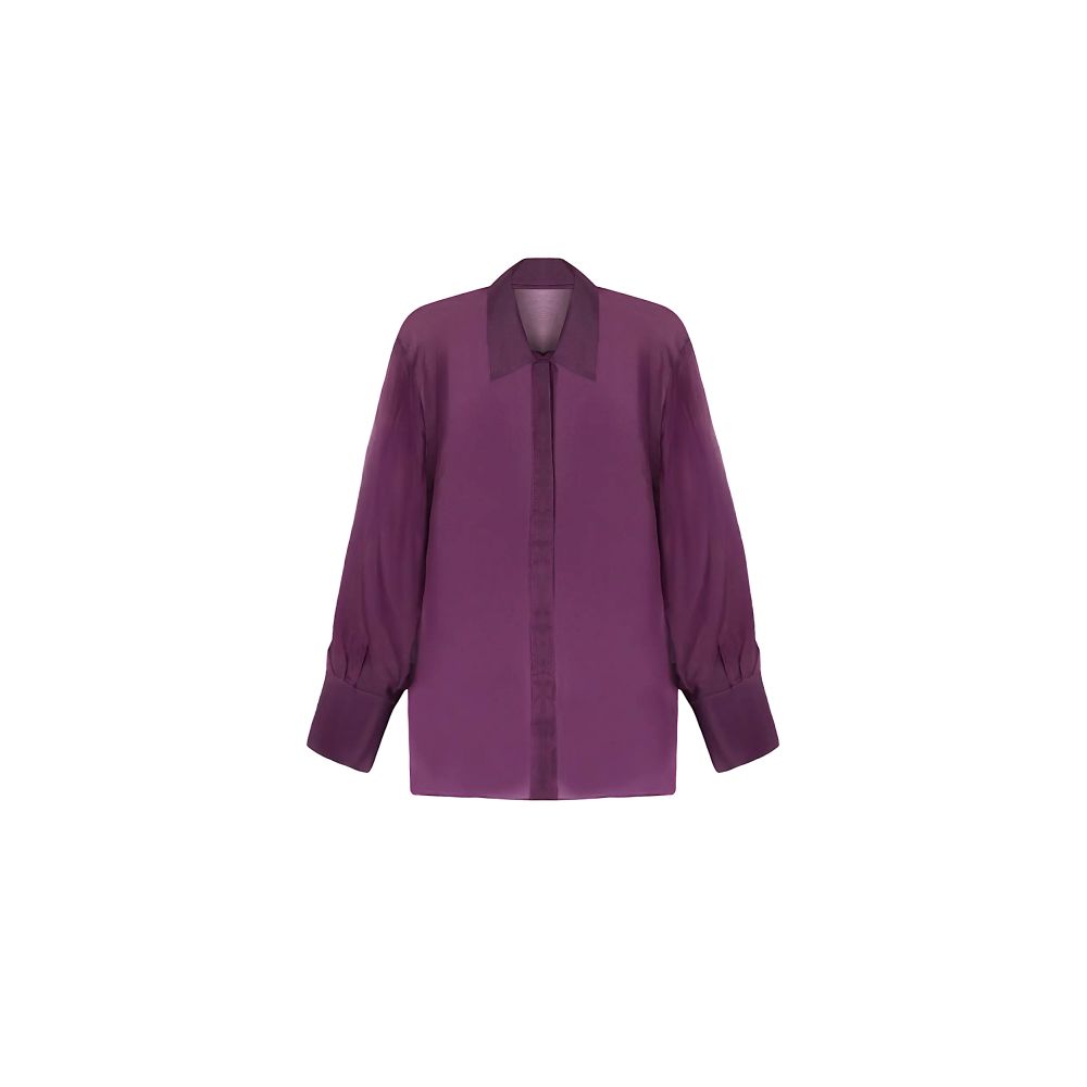 Chemisier tout en voile de soie. Col et bas de manches en voile doublé. Boutons recouverts de voile de soie. En coloris Noir, le chemisier est photographié avec un soutien-gorge Sensation Plaisir ou Désir et Volupté. En coloris Purple Désir, il est associé à un soutien-gorge Élégance Artist.