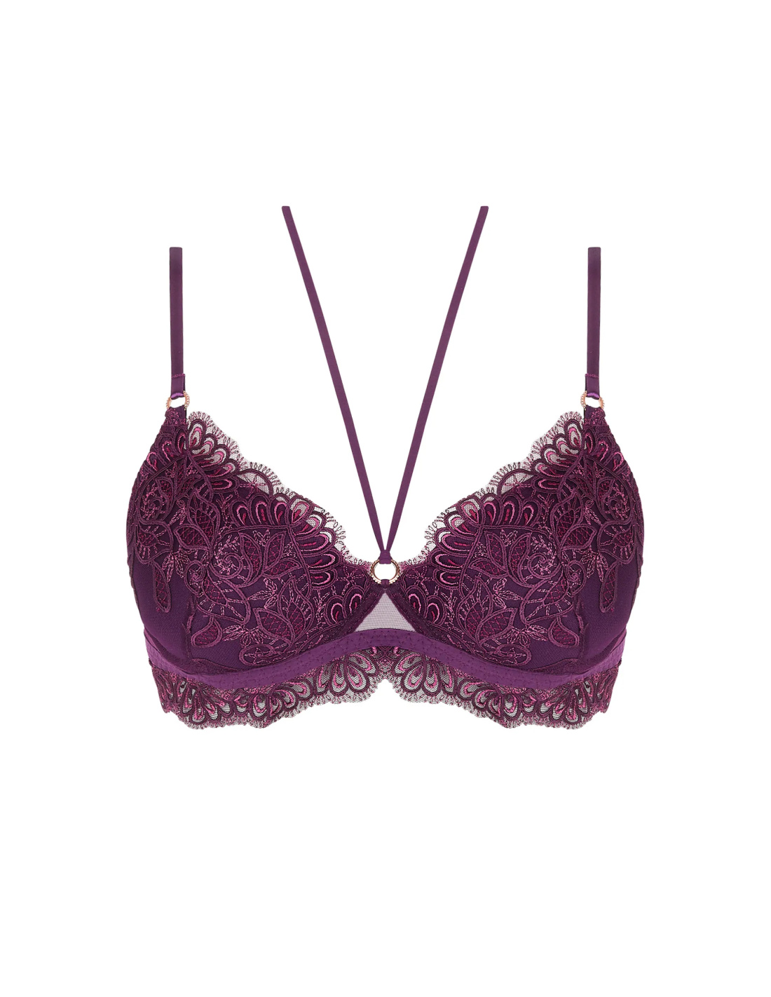 Bonnets coque recouverts en broderie festonnée au décolleté. Bande de basque en maille microfibre. Anneaux bijoux à l' entre gorge et bretelles devant. Lien pour tour de cou fantaisie.