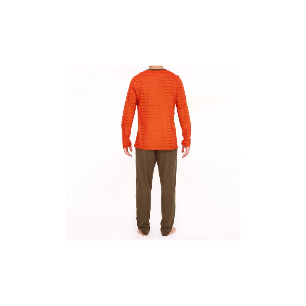Le pyjama long LEONARD HOM est un ensemble de pyjama pour homme en jersey de 100% coton dans des tons de rose, orange et kaki. Il se compose d'un t-shirt de pyjama manches longues col rond et d'un pantalon assorti.