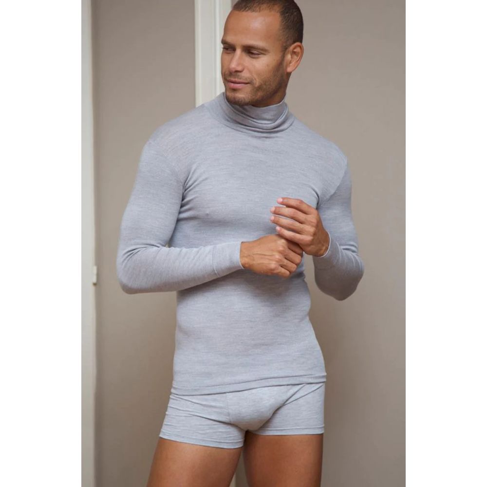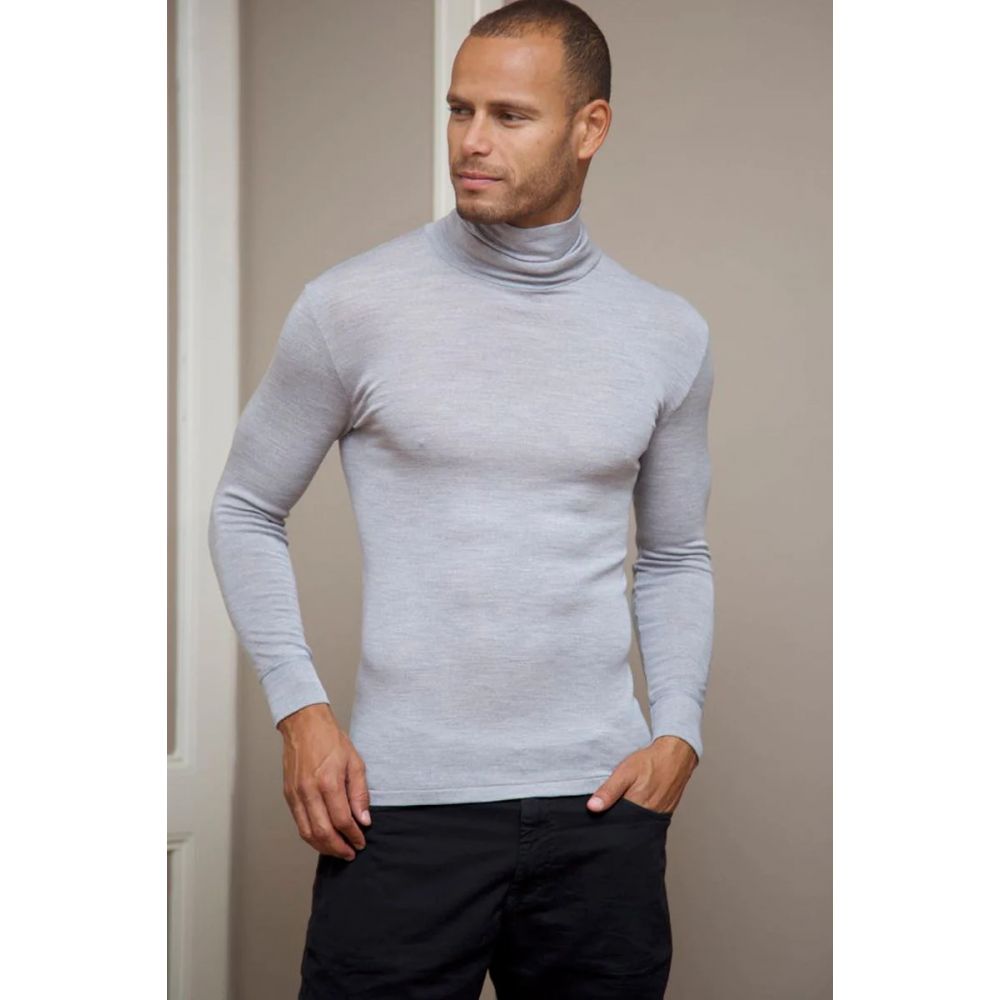 Pull à col roulé pour homme en fine laine mérinos et soie. Anti-rétrécissement, respirant, isolant et très chaud. Fabriqué exclusivement avec des fibres naturelles. La chaleur de la laine alliée à la douceur de la soie.