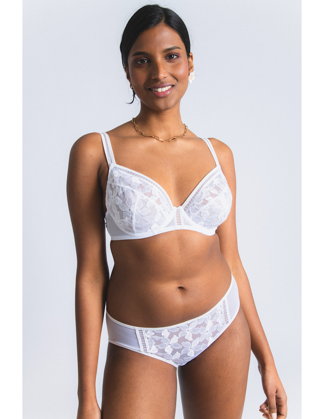 Un soutien-gorge avec armatures en broderie florale, alliant séduction et modernité, imaginé spécialement pour les poitrines généreuses.