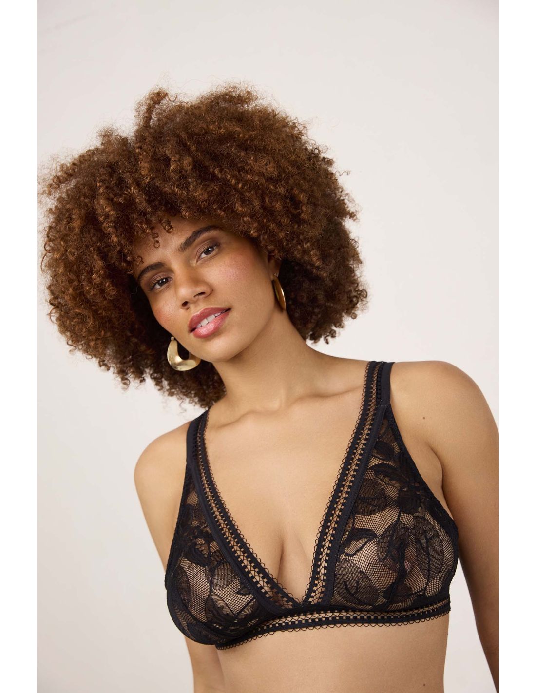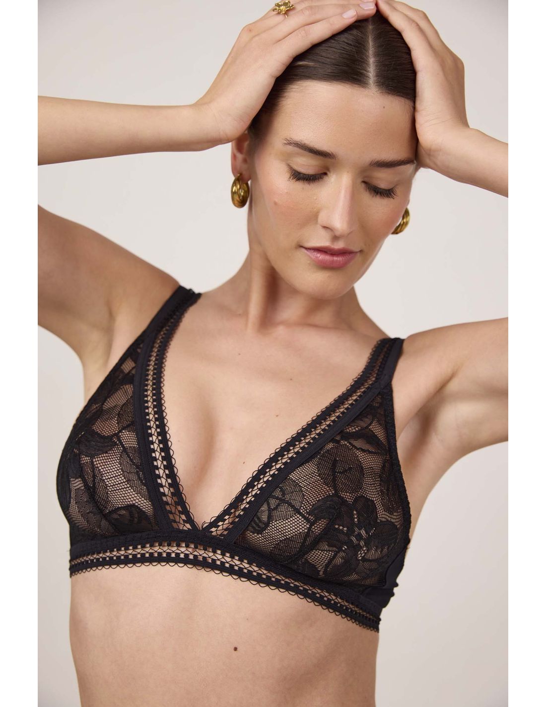 Un soutien-gorge triangle souple, sans armatures, en dentelle française et au dessin floral : un intemporel moderne et féminin.