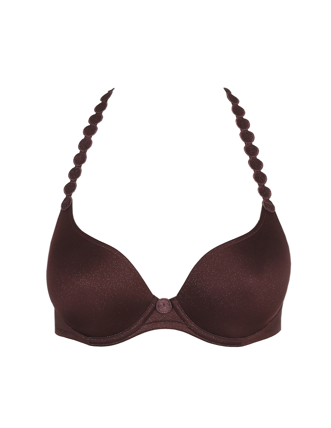 Un soutien-gorge avec bonnets en mousse et décolleté cœur. Ses bonnets montent haut sur la poitrine, mais descendent très bas à l’entre-bonnet. Son dos en tulle transparent est droit, et ses bretelles peuvent se porter droites ou en tour de cou. Ce modèle remonte et sépare joliment les seins sans exagérer l’effet push-up.