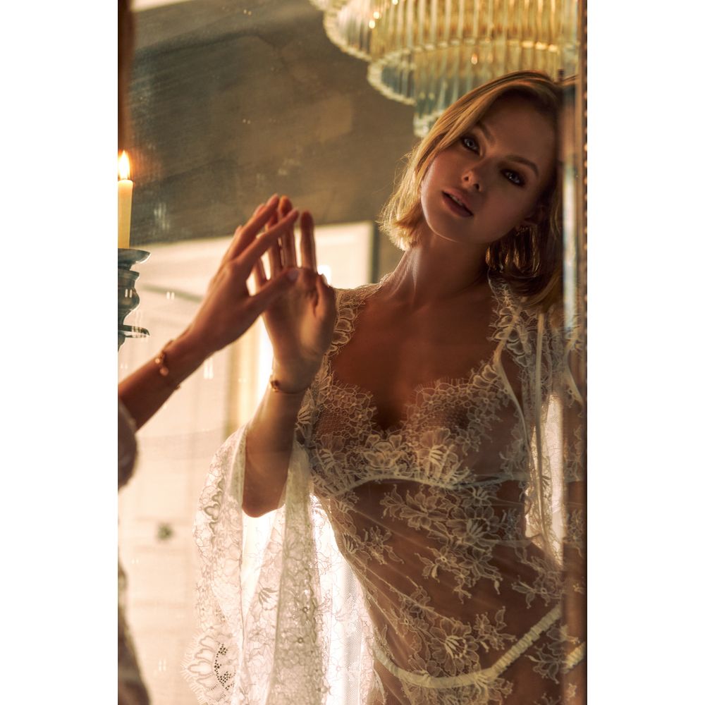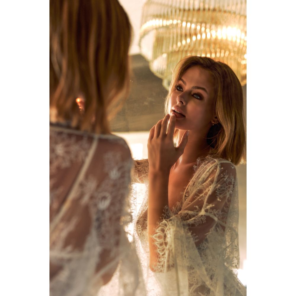 Craquez pour l’incontournable Kimono Synthie dans sa nuance naturelle entièrement confectionné en dentelle broderies. Ses délicieux jeux de transparence dévoileront votre silhouette avec grâce et raffinement.