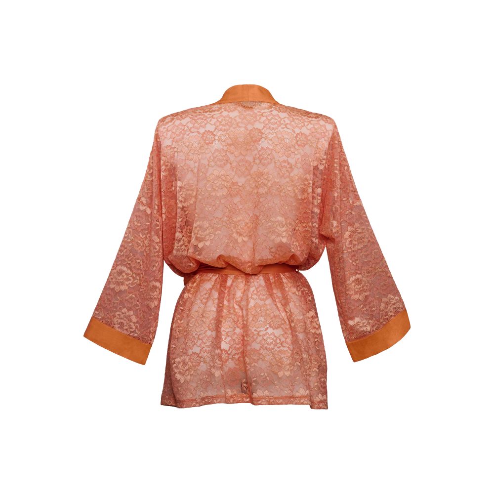 Découvrez le kimono transparent Carita, conçu avec une finesse moulante dans une nuance orange chaude rappelant la crinière d'un lion. Ce kimono est orné d'une dentelle somptueuse rehaussée de lurex qui ajoute une touche d'élégance spectaculaire à votre look. À la fois audacieuse et raffinée, la délicate bordure en dentelle sublime magnifiquement la silhouette fluide et apporte la touche finale à votre ensemble de lingerie. Célébrez votre force et votre féminité avec ce kimono exquis, conçu pour sublimer vos courbes et sublimer votre sensualité.