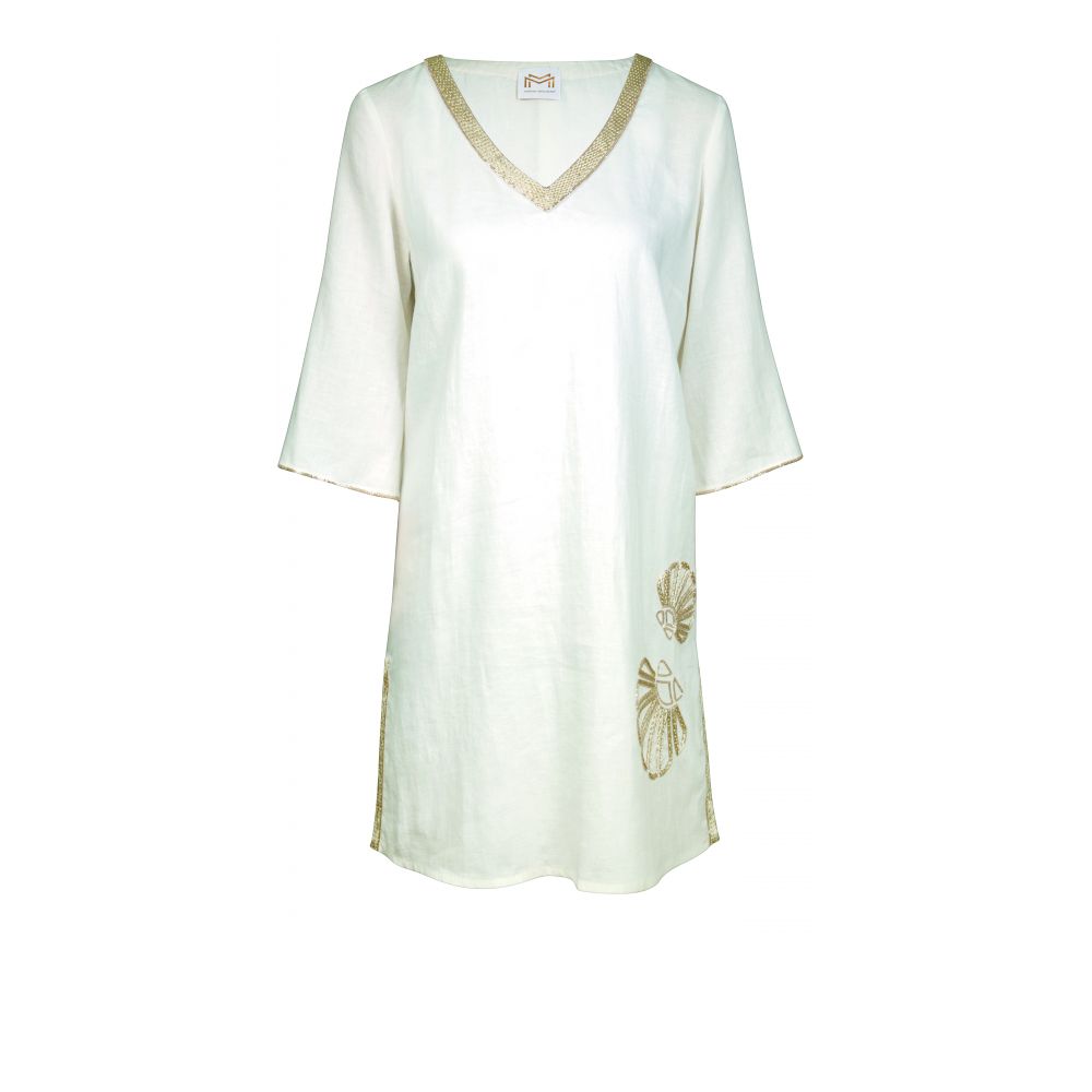 Tunique de longueur genou avec un chatoiement délicat, une encolure en V et des manches ¾.