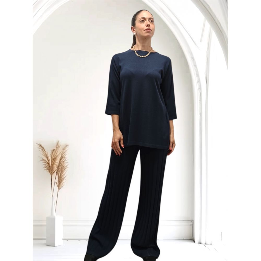 Cette tunique en viscose extensible allie confort et style grâce à sa coupe douce et raffinée. Elle présente une élégante encolure bateau, des manches ¾ pratiques et une demi-ceinture au dos qui met en valeur la silhouette. Le point jersey sur le devant et le dos côtelé apportent une touche sophistiquée, rendant cette pièce polyvalente idéale pour de nombreuses occasions.