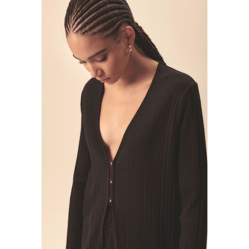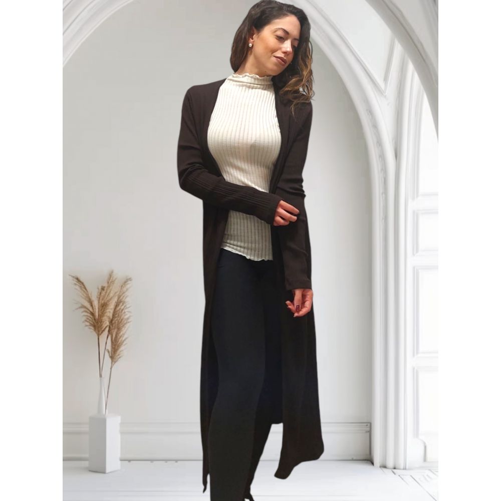 Long manteau à manches longues en mélange de tissu côtelé délicat en laine mérinos extra fine et en soie pure de haute qualité, présentant un motif contemporain et une nouvelle texture donnée par l'irrégularité du côtes.