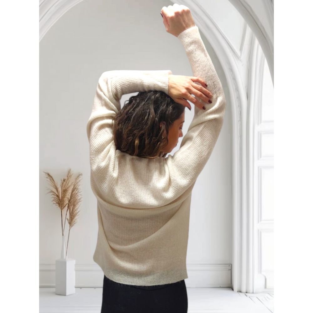 Pull à col en V en baby alpaga et en laine mérinos extra fine caractérisé par une fabrication très douce et fine.La combinaison de ces deux fibres crée un pull confortable, chaud et douillet qui enveloppe le corps.Un pull à manches ballon avec une coupe régulière.