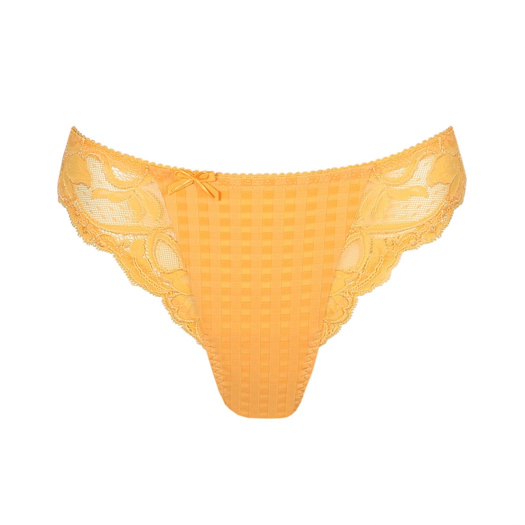 String sexy en maille à carreaux généreusement orné de dentelle et décoré d'un petit nœud à la taille. Optez résolument pour une couleur chaude avec ce nouveau coloris Mango, une nuance safrané.