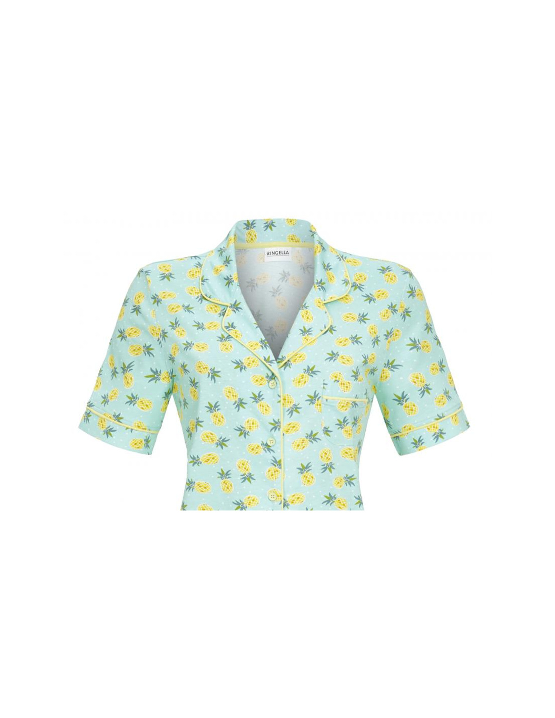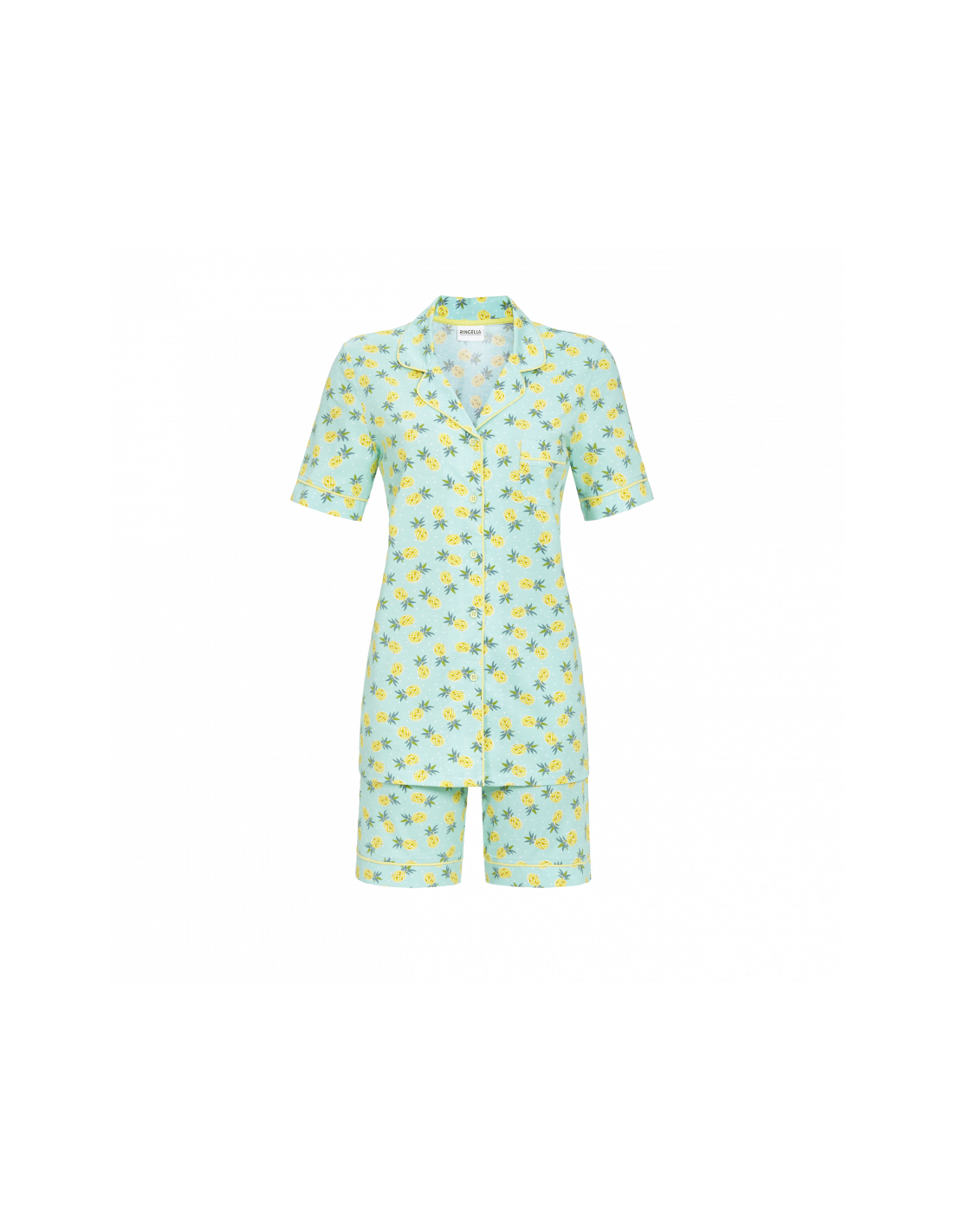 La belle allure fait le charme de ce modèle. Un design all-over avec des ananas orne ce modèle. Ouvert en forme de revers boutonné avec passepoil contrasté à l'encolure, aux manches, à la jambe de pantalon et à la petite poche poitrine. Le short a une taille élastique douce. Le coton doux en qualité jersey simple est agréable sur la peau. Le matériau est respirant et facile d'entretien.