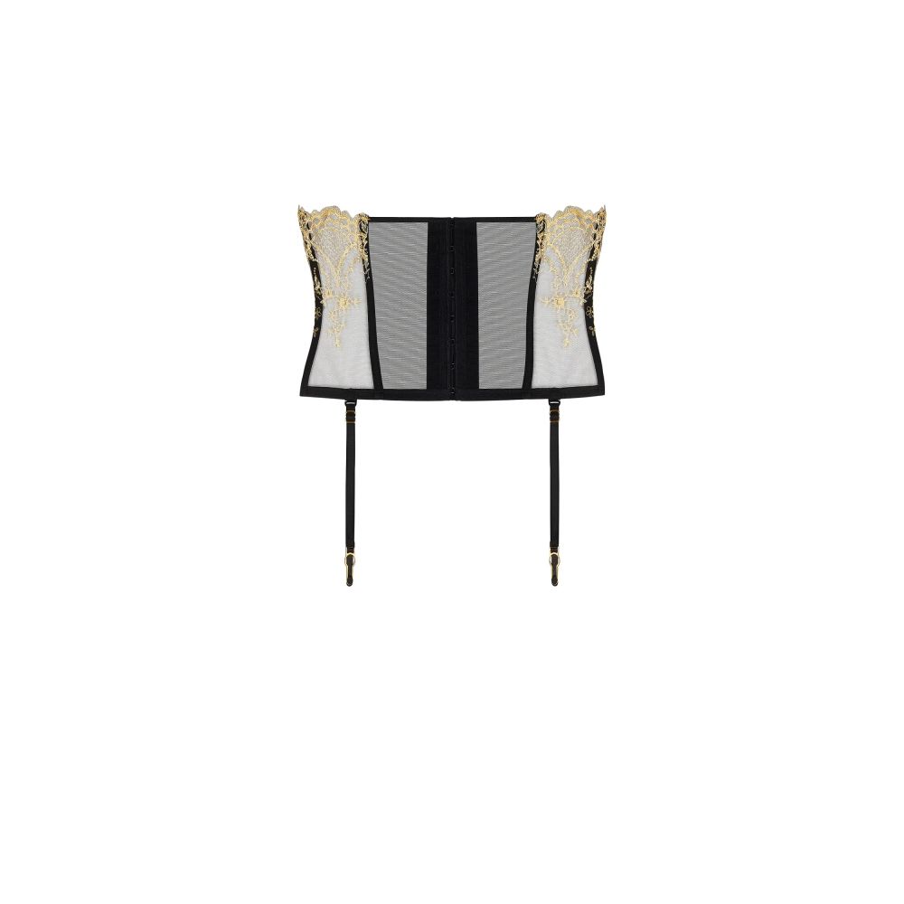 Broderie laminée festonnée, devant et côtés, tulle lycra au dos. Crochetage au mileu dos et jarretelles amovibles avec bouclerie métal or.