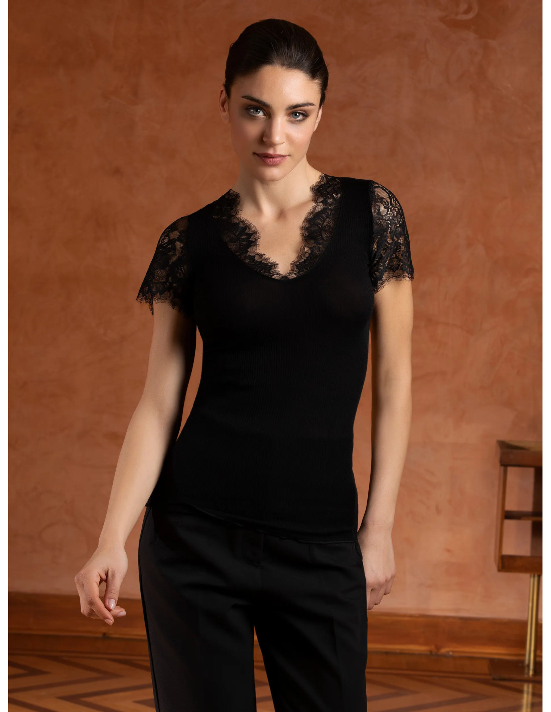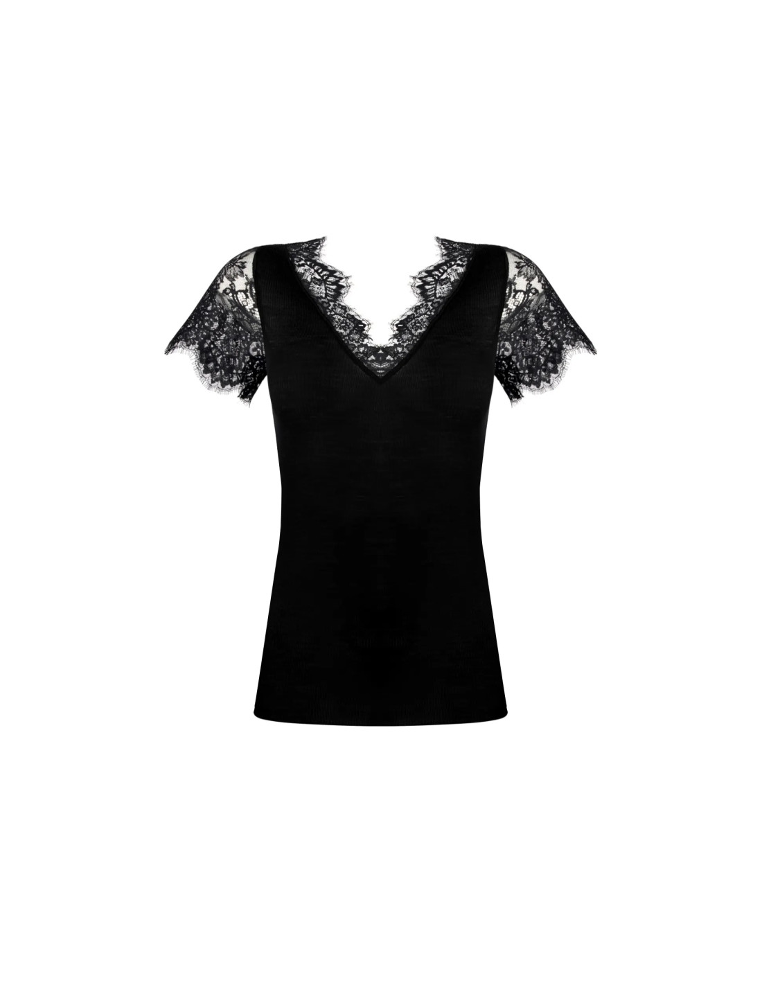 Tee-shirt manches courtes en maille tubulaire avec incrustation dentelle sur le décolleté devant et sur les manches.