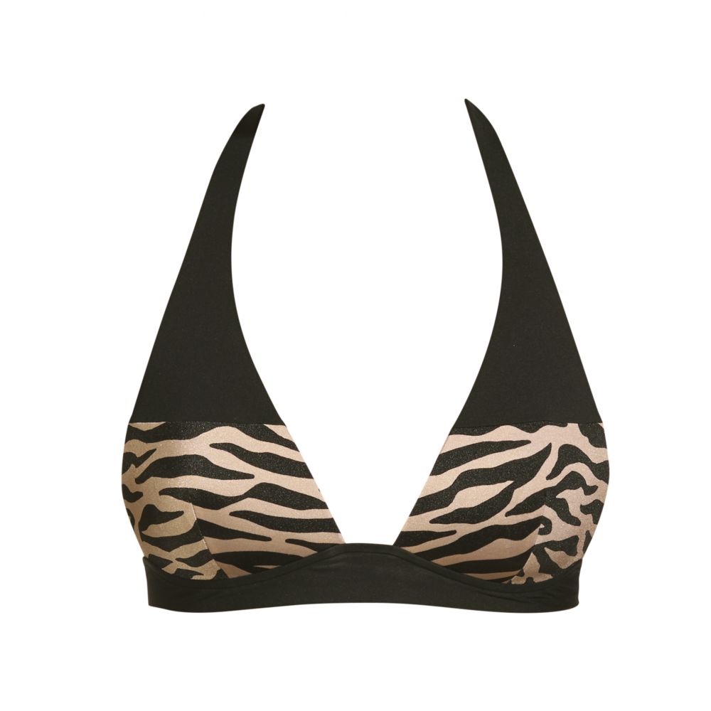 Brassière avec bonnets rembourrés. Jeu parfait de combinaison des deux tissus, uni et imprimé, pour une image plus puissante. Sous-poitrine en tissu uni identique aux liens attachés au cou. Disponible dans les bonnets BC. Wild, imprimé animalier sur fond chair pour un meilleur réalisme et pour contraster avec le tissu uni noir.