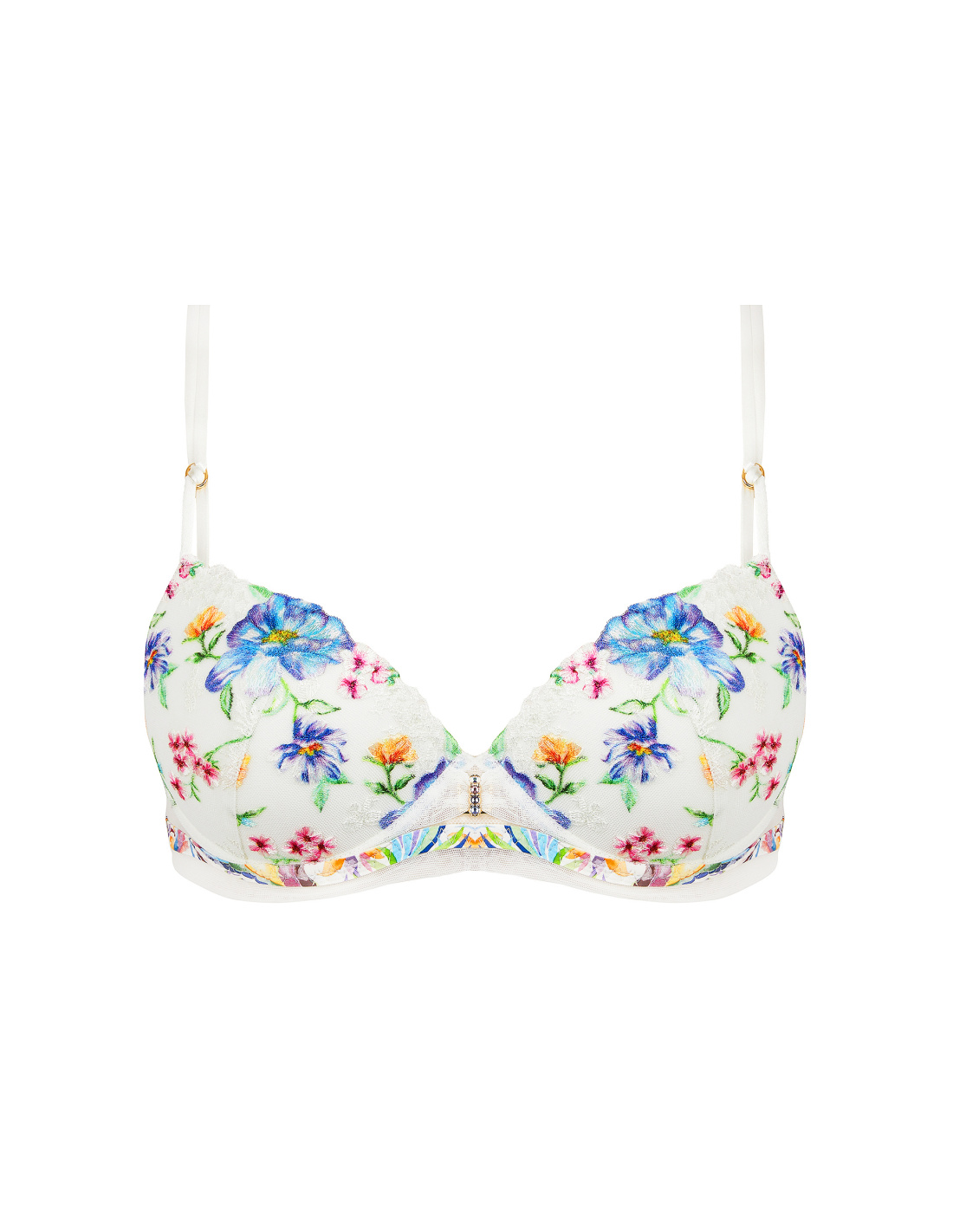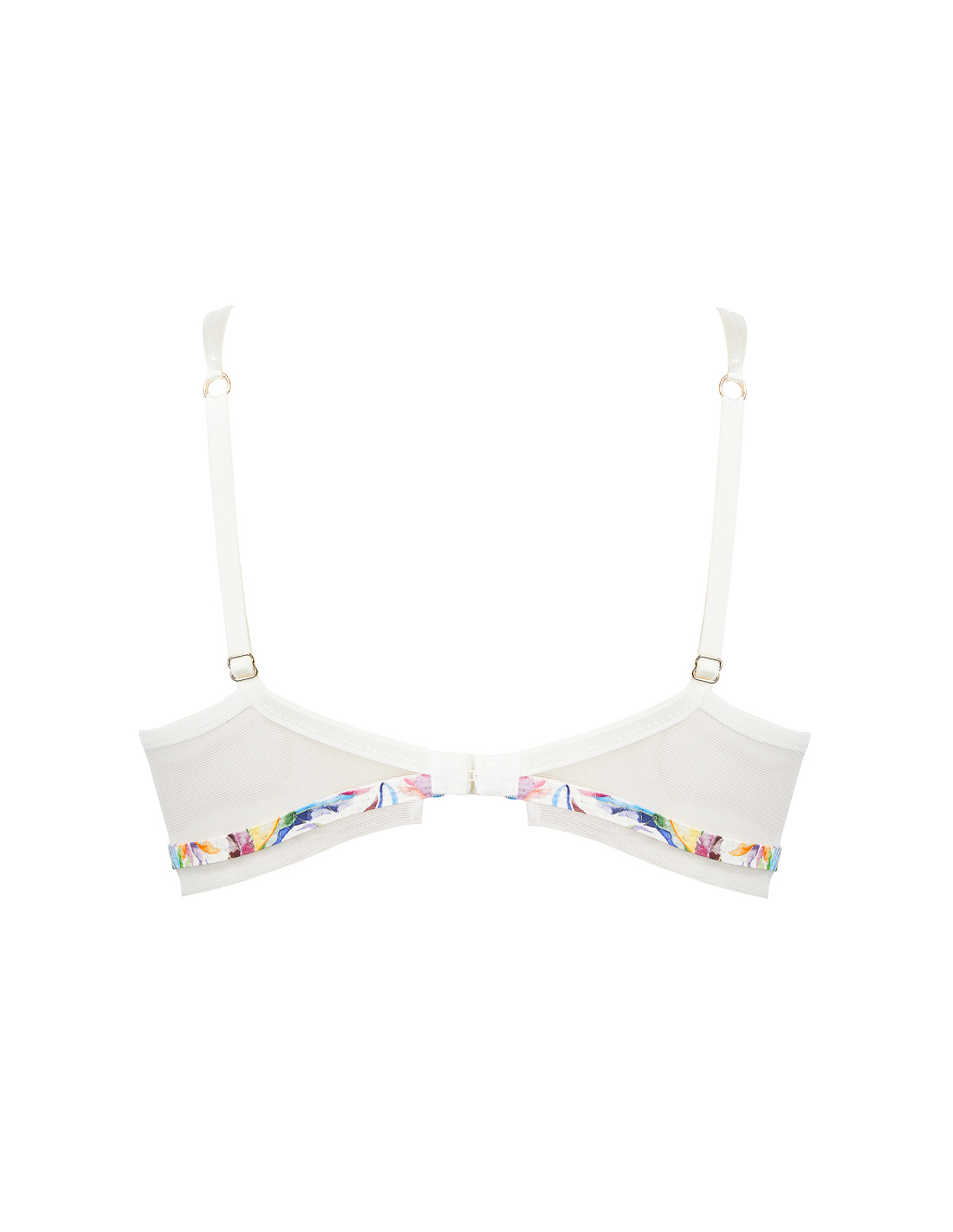 Bonnet en broderie imprimée, festonnée au décolleté. La basque, en tulle confort est enrichie d'un fin liseret de maille imprimée coordonnée à la broderie vers le bas. Les bretelles sont agrémentées d'un anneau doré. L'entre-gorge en tulle transparent, est sublimé d'un bijou strassé maintenu par un papillon de tulle.