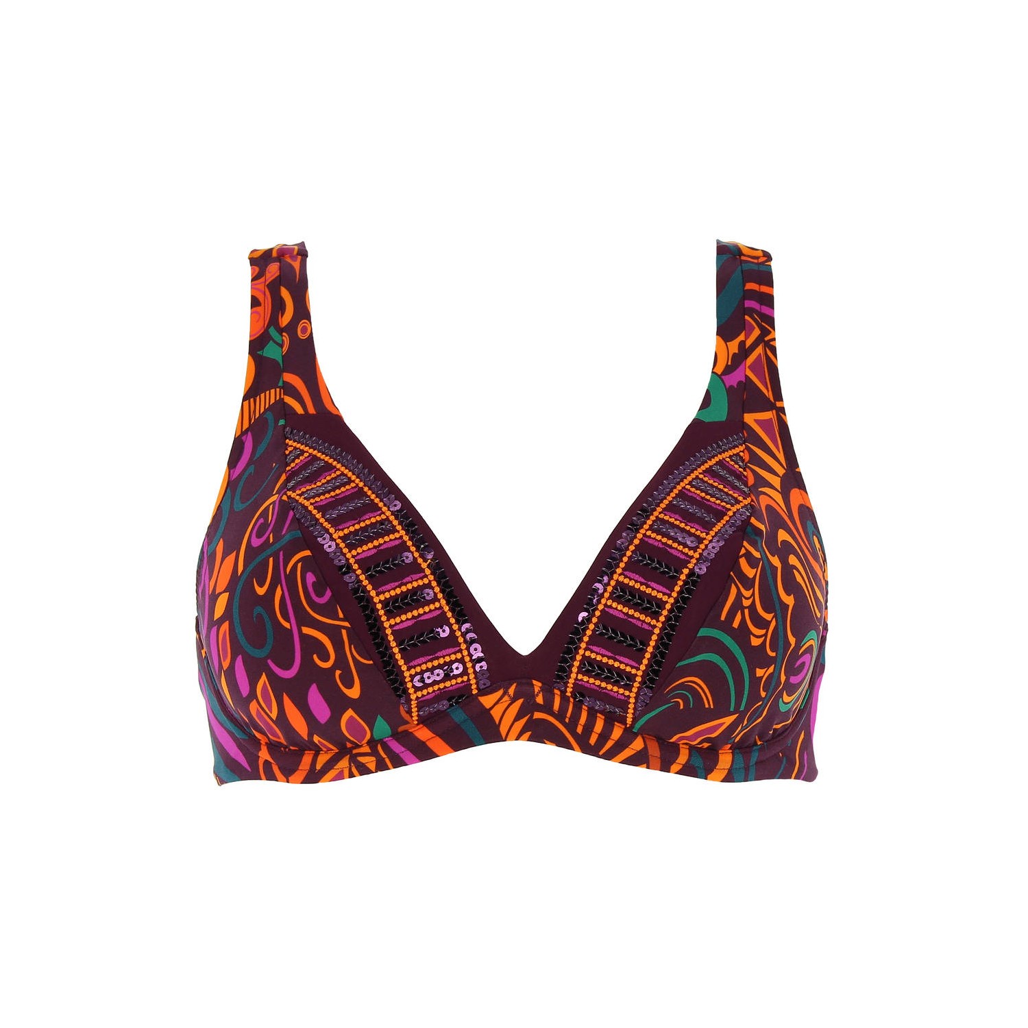 Maillot de bain à armatures triangle Beauté Tribale LISE CHARMEL en maille balnéaire à imprimé graphique d'inspiration africaine. Bonnets doublés de tulle et de maille, pour un meilleur maintien. Broderie graphique et sequins sur le haut des bonnets. Bretelles multipositions extensibles et réglables. Fermeture dos par clip.