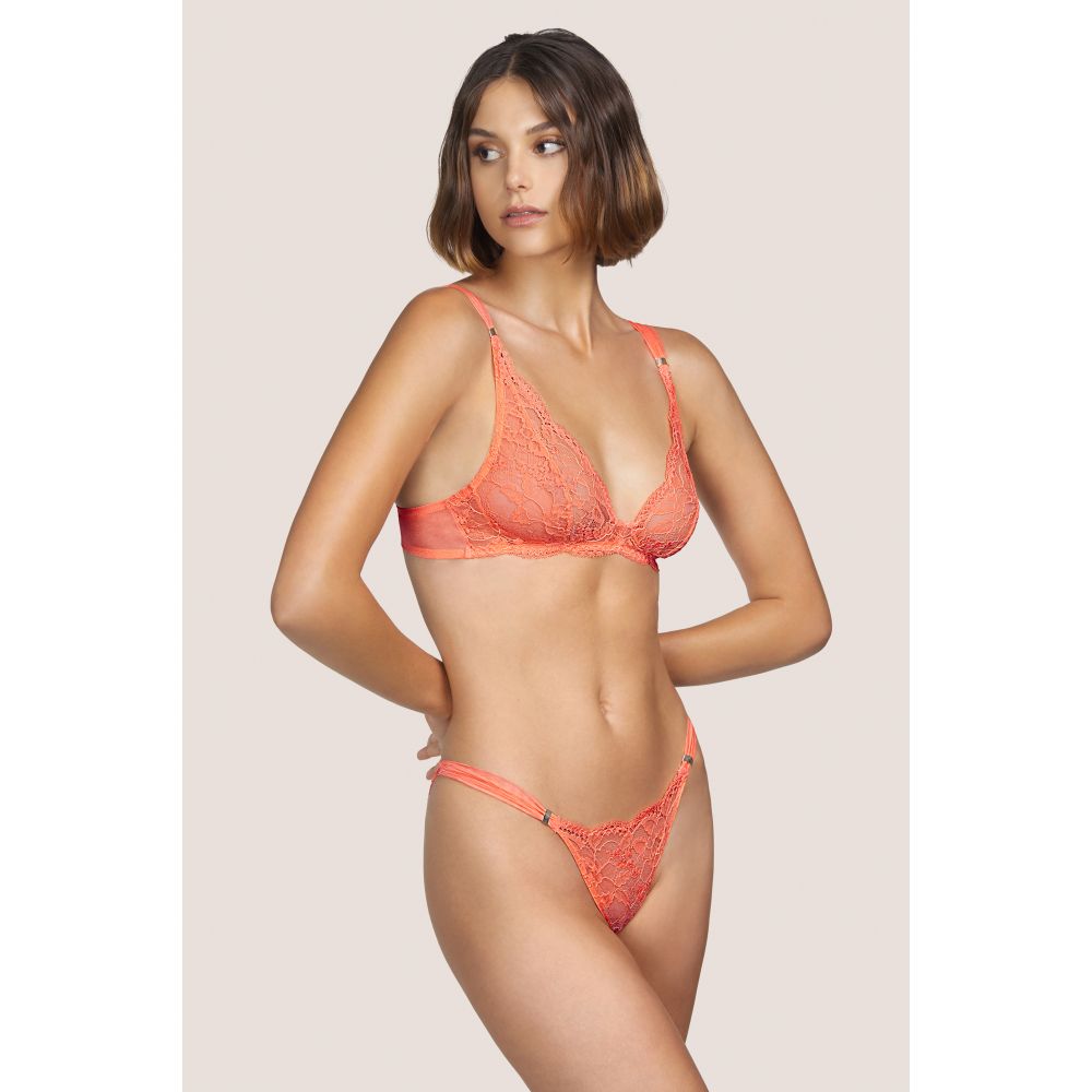 Slip brésilien. Utilisation abondante de la dentelle à l'avant et au dos, très échancré et sensuel. Papaya, une couleur tout aussi fraîche et élégante, tout à fait dans le style d’Andres Sarda et de sa prédilection pour les teintes plus surprenantes.