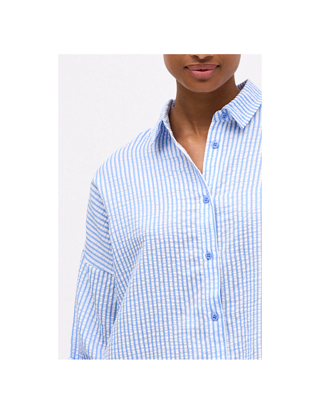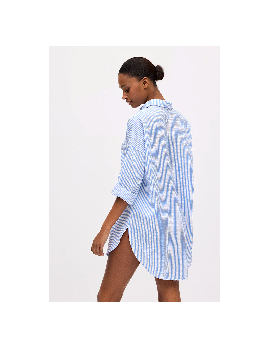 Chemise extra longue en tissu texturé. Imprimé rayé bleu et blanc. Vêtement cool à porter confortablement tout l'été. Combinez-le avec des tongs et un bikini assorti et complétez votre look.