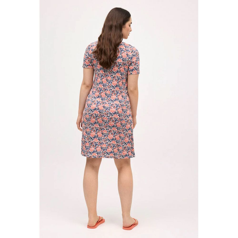 Robe courte à imprimé floral. Col rond et manches courtes. Tissu frais et léger. Associez-le à un maillot de bain ou un bikini de la collection et complétez le look.